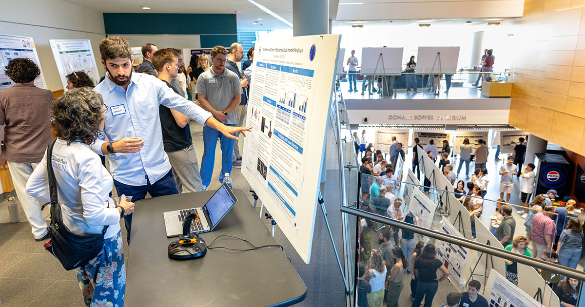 Each year, undergraduates spend over two months immersed in faculty labs, collaborating with professors, graduate students and peers before presenting their findings at this highly anticipated tradition, first held in 2011. This year’s event featured 96 students presenting their research at a poster session in the Shapiro Science Center, where they explained their findings with visitors from across the Brandeis campus.